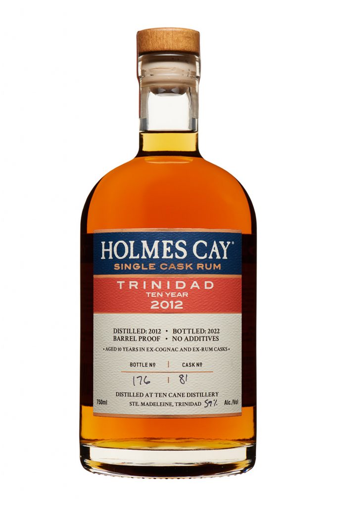 Holmes Cay Trinidad 2012 10 Year edition — two casks from the now defunct 10 Cane distillery in Trinidad. The original lightly aged, cane juice mixer has become a mature and complex rum to sip and enjoy, bottled at full barrel proof or 59% ABV. These special barrels are getting a second life as aged rum that will never be recreated again. The all fresh cane juice, 100% pot still rum was double distilled in 2012 in Trinidad, tropically aged in ex-cognac casks for 4 years, then spent 6 years in ex-bourbon in the UK before being bottled in New York State.